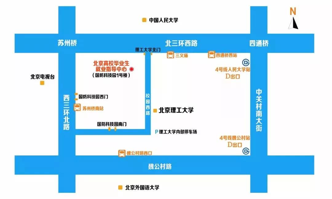 路线一:地铁4号线,人民大学站D口出→沿北三环西行1000米到达北京理工大学北门→沿校园西路向南500米在停车场路口向西200米到达北理工科技园南门→进入园区南门后向北直行200米后,再右转100米,到达1号楼连廊双选会场地入口处。
