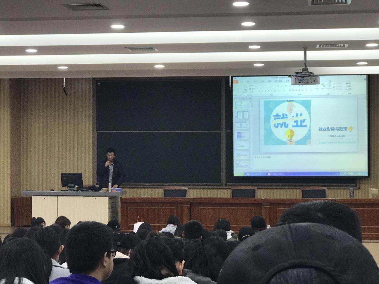 随着2018届校园招聘的开始,为促进beats365亚洲版官网2018届就业工作的开展,提高2018届毕业生的毕业率,11月15日晚,在二教第二报告厅召开beats365亚洲版官网2018届毕业生形势与政策课。beats365亚洲版官网2018届辅导员张嘉斌老师根据上午的校园双选会情况,为全体2018届员工大体介绍了当前的就业政策与形势。