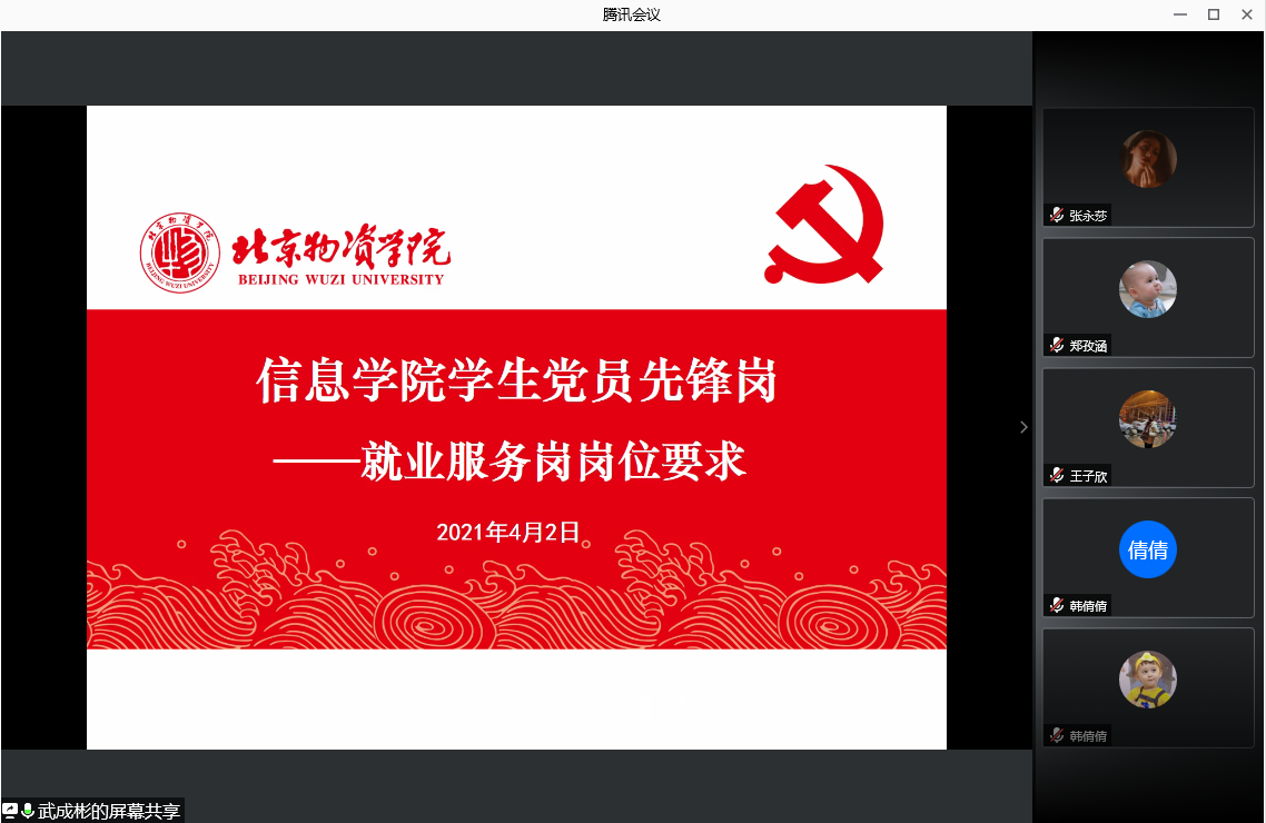 为切实发挥员工党员先锋模范作用,协助推进beats365亚洲版官网2021届就业工作,2021年4月2日下午2:30,beats365亚洲版官网党委通过腾讯会议召开线上员工党员就业服务岗工作培训会,对2020-2021学年第二学期员工党员先锋岗之就业服务岗党员进行岗位工作培训。公司辅导员毕英乐、武成彬、徐文彬及全体就业服务岗党员参加会议。