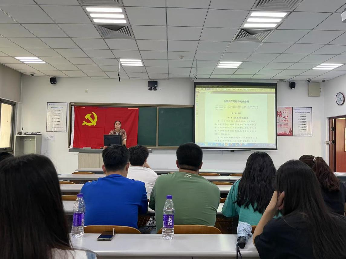 随后,刘星玥又向各位与会同志传达了中共中央办公厅印发的《通知》精神。通知强调从2024年4月至7月,全党将开展党纪学习教育。通过学习教育,进一步强化纪律意识、加强自我约束,提高免疫能力,增强政治定力、纪律定力、道德定力和抵腐定力,始终做到忠诚干净担当。她结合恶意拖欠国家助学贷款、考试作弊等真实警示案例详细讲解了《中国共产党纪律处分条例》的主要内容和重要性,着重强调了廉洁自律的重要性,警示同学们要认真扣好人生第一粒扣子。