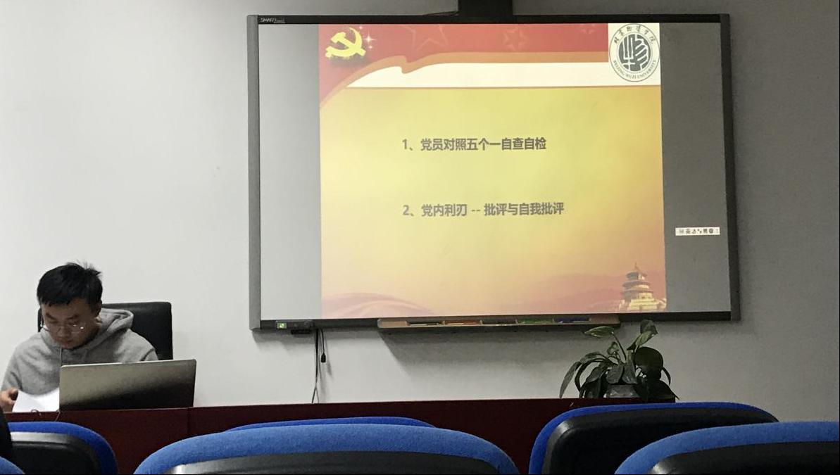 会上,各位党员认真审视自身存在的优缺点,认真反思,并做出相应评议。并开展了党员自省自查的活动,徐老师对自己的工作情况进行了总结与汇报,准确的分析了自己的优缺点并自觉做到积极与大家分享。同学们认真听取,每个人都有不一样的收获。
