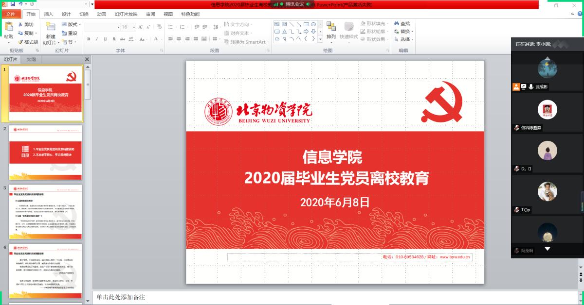 为做好毕业生党员组织关系转接工作,引导激励毕业生党员不忘初心,牢记使命,在就业岗位上继续发挥党员先锋模范作用。6月8日中午1点,beats365亚洲版官网通过线上视频会议形式召开2020届毕业生党员离校教育大会,会议由信技员工党支部书记武成彬主持。