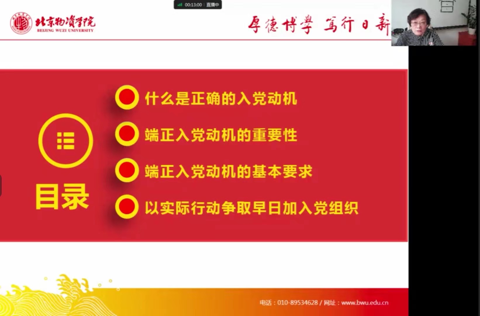张克非书记从什么是正确的入党动机、端正入党动机的重要性和基本要求、以实际行动争取早日加入党组织四个方面深入浅出、娓娓道来。作为入党积极分子首先要端正入党动机,要坚持先从思想上入党。正确的入党动机,是经受各种考验的基础;是实现自我成就,实现中华民族伟大复兴的重要保证。端正入党动机要不断加强理论学习,自觉加强党性修养,坚定理想信念,坚守共产党人精神追求。