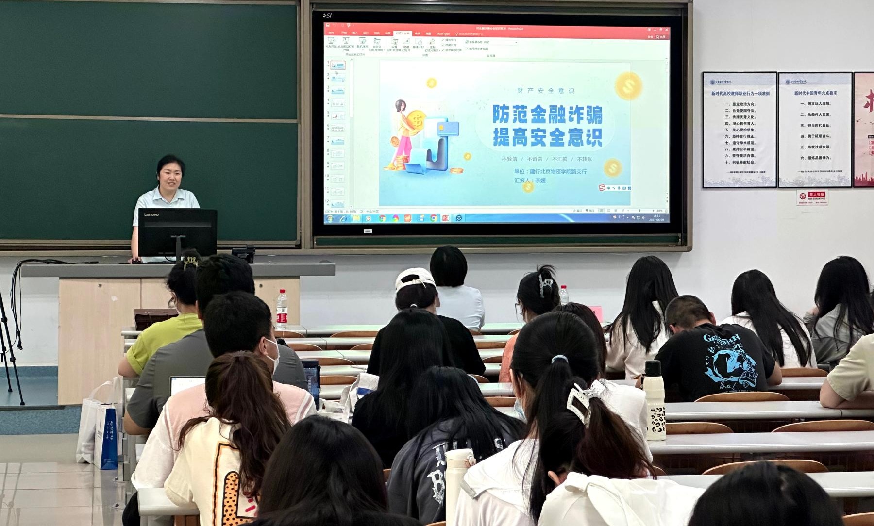 反诈宣传进校园,携手共筑“防骗墙”,为提高广老员工防骗意识,加强防诈宣传力度,beats365亚洲版官网信管员工党支部邀请“红色1+1”共建支部--中国建设银行物资公司路支行党支部于2023年6月9日入校进行《今天我开讲之防诈骗宣讲》主题活动。中国建设银行物资公司路支行党支部党员李叶、丁龙禹、李媛、信管员工党支部全体在校生党员参加此次宣讲会,会议由beats365亚洲版官网毕英乐老师主持。