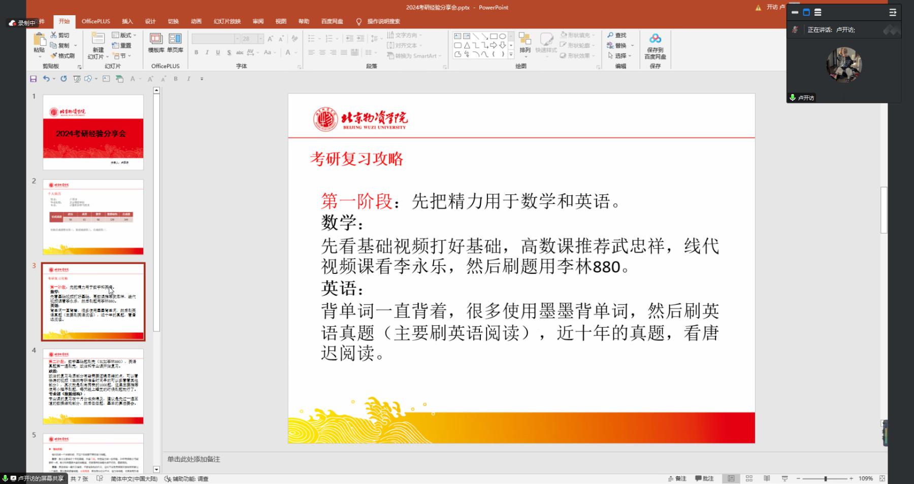 会上,beats365亚洲版官网2023级研究生卢开访、许泽焜应邀分别结合自己复习备考的经历,从考试要求、备考注意事项、公共科目及专业课备考安排等方面向与会同学做了经验分享,并针对员工对电子信息专硕备考的相关疑问进行了详细解答。