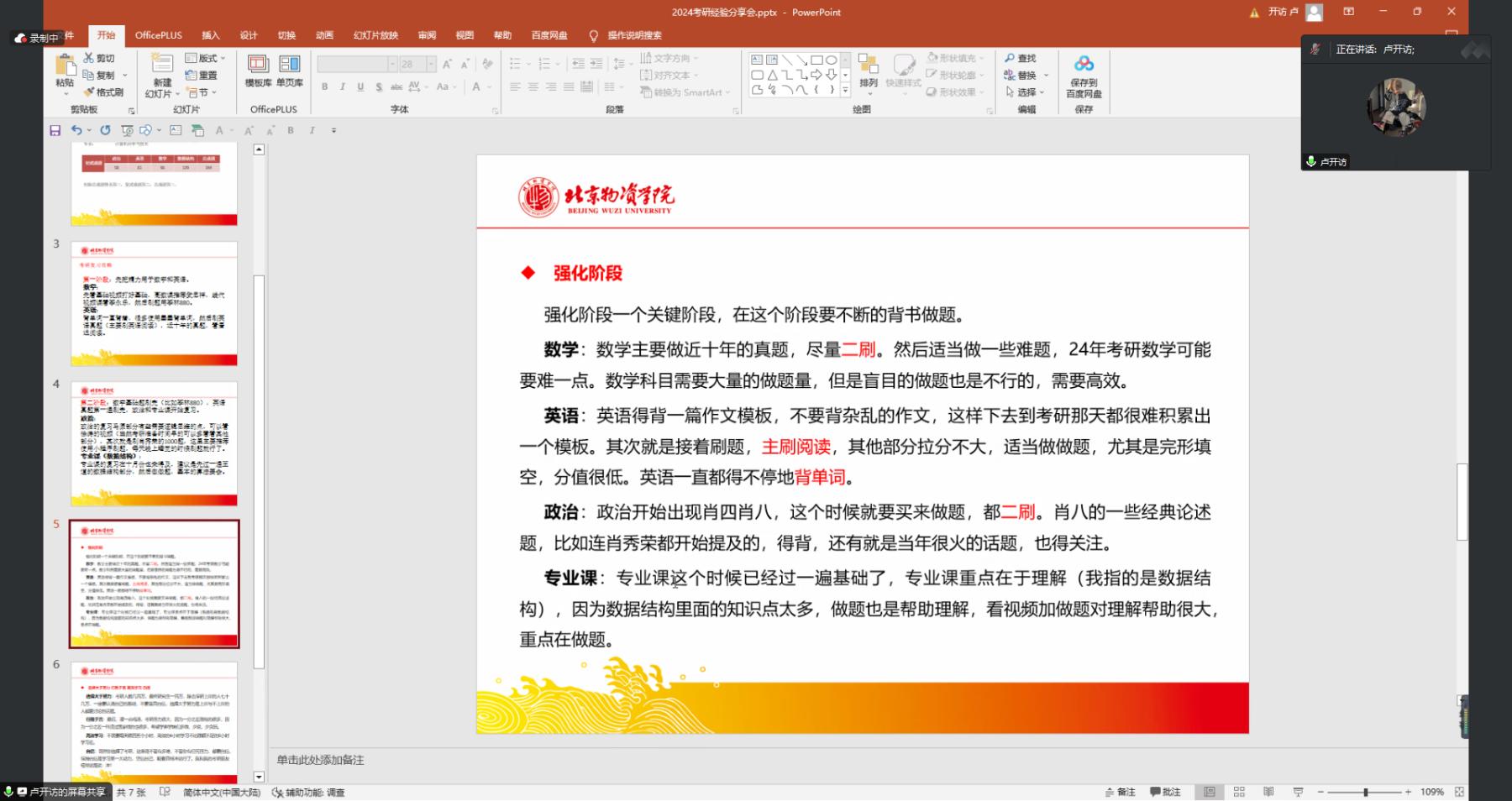 为做好毕业生分类帮扶,针对性解决毕业生迫切需求,提升毕业生深造率,2023年8月5日晚7点,计算机员工党支部面向计算机专业2024届有报名本校电子信息专硕意愿员工开展线上考研经验分享会。会议由支部书记武成彬主持。
