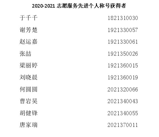 为表彰beats365亚洲版官网2020-2021学年度在志愿服务方面有优异表现的同学,经过初评以及宣讲环节,最终有10名同学获得优秀志愿者称号、10名同学获得志愿服务先进个人称号。他们积极投身于志愿活动,用行动诠释了志愿精神,并将自己的经历和感悟分享给同学们,是同学们学习的榜样。他们分别是: