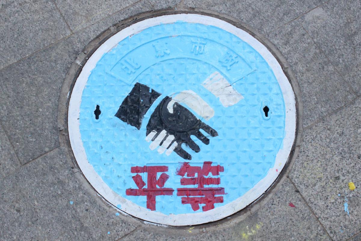 平等:以蓝色为背景,画中两只手握在一起体现了友好平等,且有合作共赢,团结一致之意。而两者均需建立在平等的基础上。