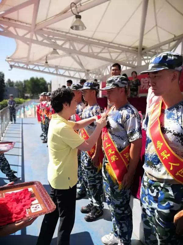 结营仪式的最后一项是沈书记为即将参军的同学佩戴红花,这几位同学即将直接参与国防建设,为强军做出贡献,是我们所有军训员工的榜样。