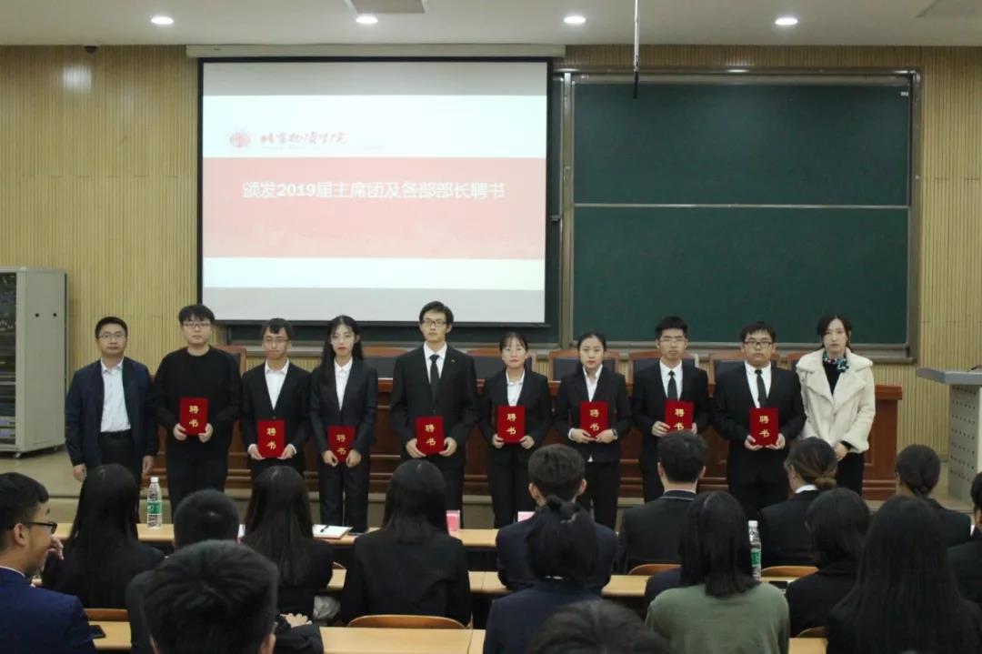 大会第二项,由王有老师和丁悦老师为共同为主席团及各部部长颁发聘书。紧接着,由主席团为19届各部委员和各部干事代表颁发聘书。
