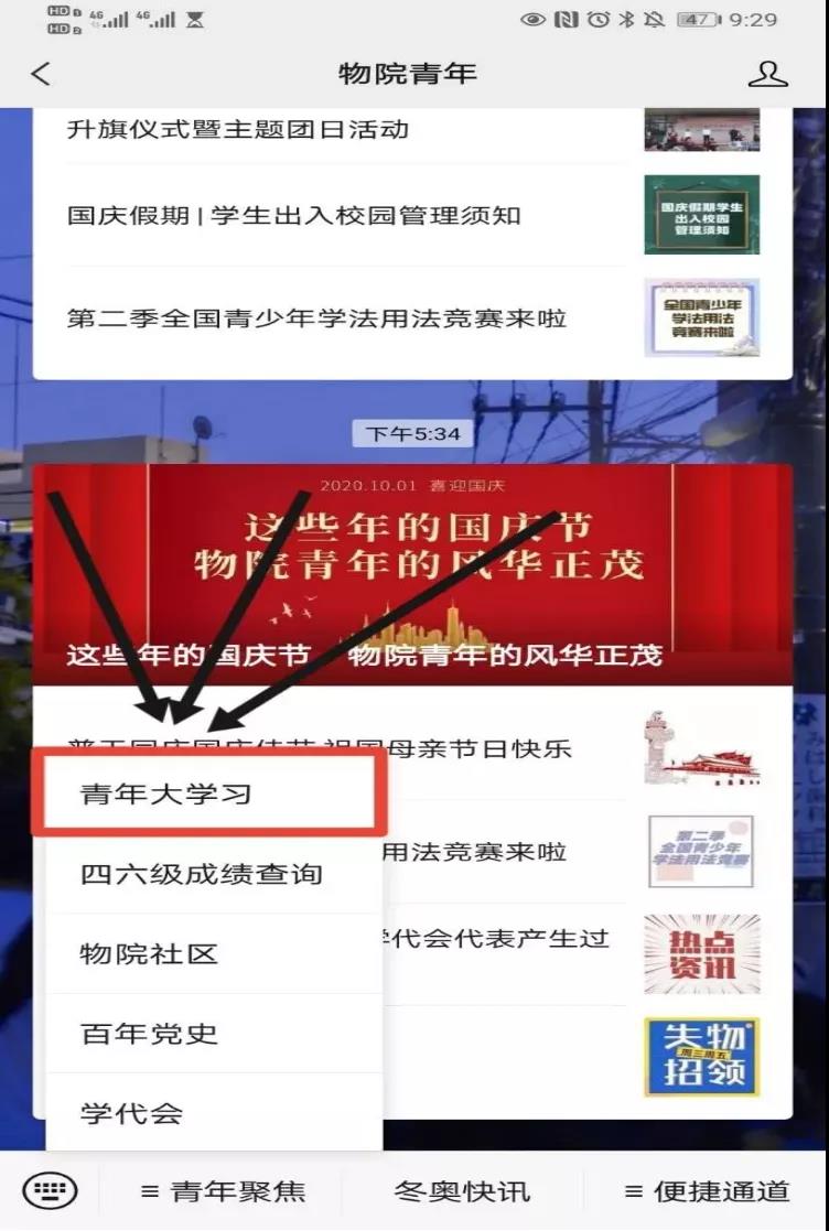 1.进入物院青年公众号,点击“青年聚焦”➡“青年大学习”