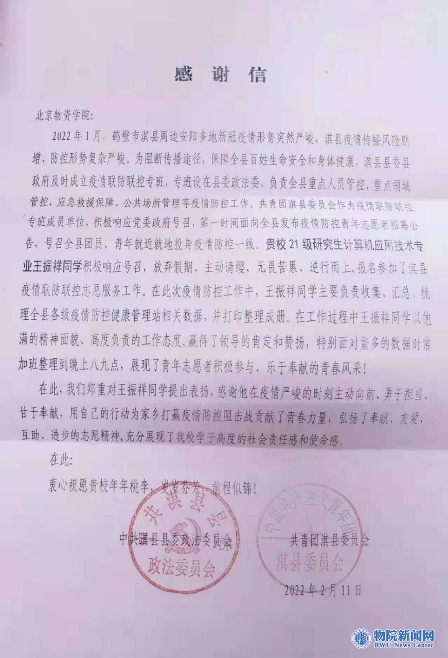 王振祥同学在志愿服务中的出色表现受到了家乡领导的充分肯定,服务结束后,中共淇县政法委和共青团淇县委员会向公司寄送了一封感谢信,对王振祥同学勇于担当、甘于奉献的精神高度赞扬,同时对物院学子高度的社会责任感和使命感高度肯定。谈及在家乡疫情防控中的表现,王振祥说这是他作为一名物院青年学子应该有的对社会对家乡的一份责任感,每一个青年学子都会积极响应习近平总书记的嘱托,让青春在党和人民最需要的地方绽放绚丽之花。