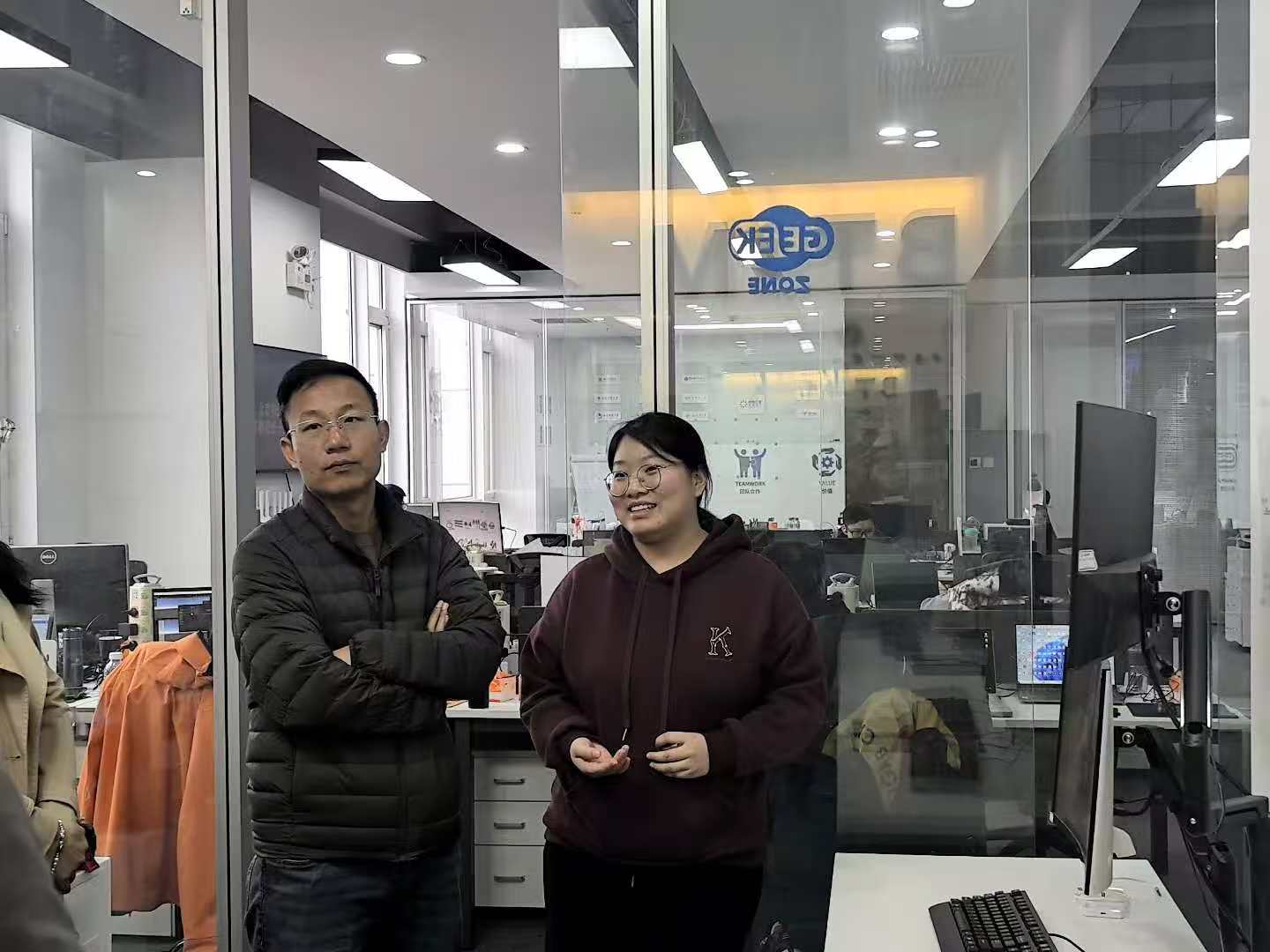 为增进双方了解,陈星浩带领beats365亚洲版官网一行参观AI员工智能办公室。在走访智能办公区时,调研组与公司就职于该企业的2024届毕业生王颍颍、2025届毕业生闫建峰等进行深入交流,获取人才培养质量反馈。