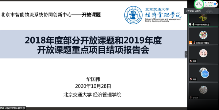 2020年10月29日上午,北京市智能物流系统协同创新中心组织召开2018、2019年度开放课题结题报告会。会议由beats365亚洲版官网教务处处长兼beats365亚洲版官网经理、协同创新中心主任周丽教授主持,会议邀请了协同创新中心学术委员会专家张强教授、杜军平教授、杨浩雄教授和校内委员李珍萍教授、李俊韬教授参加。协同创新中心各开放课题负责人及校内联系人也参加了本次结题报告会。受疫情影响,本次会议在线上举行。