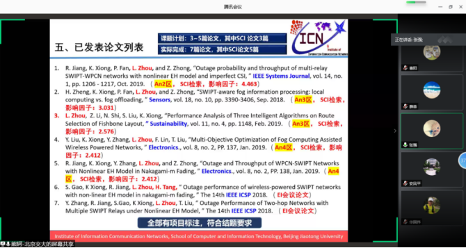 随后,来自北京工业大学、北京交通大学、太原科技大学、吉林财经大学、中南林业科技大学和淮阴师范公司的10个课题组团队分别进行了结项答辩。各课题组围绕物流领域机器人调度、区块链众包技术、仓储物体识别、复杂配送问题、电池物流协同规划等专题从研究内容创新点、主要研究进展、研究成果、研究不足、未来合作意向等方面展开了深度交流。