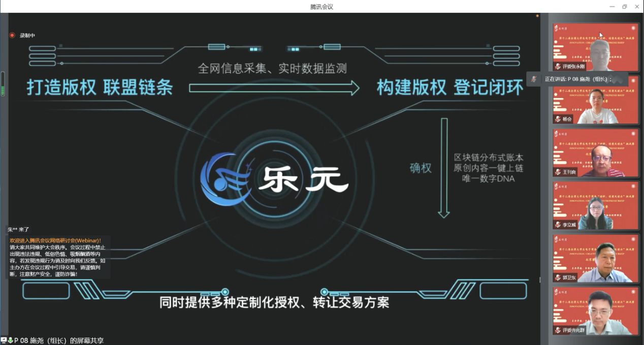 接着,各参赛团队根据抽签结果的出场顺序依次进行8分钟的作品展示。评委专家观赛、查阅作品计划书、承诺书等相关参赛文件,在回避本校团队的情况下,按照创新、创业、创业、演讲、文案分别对每一队作品进行打分。