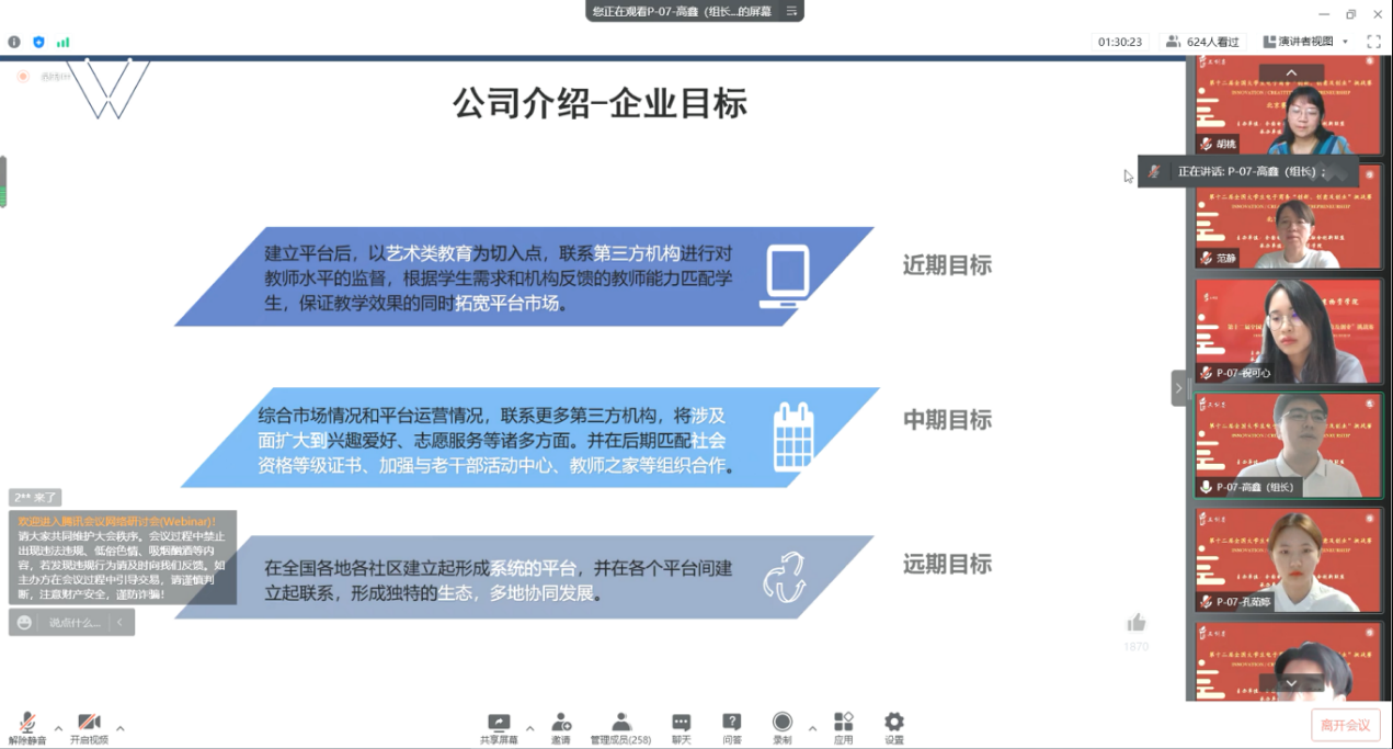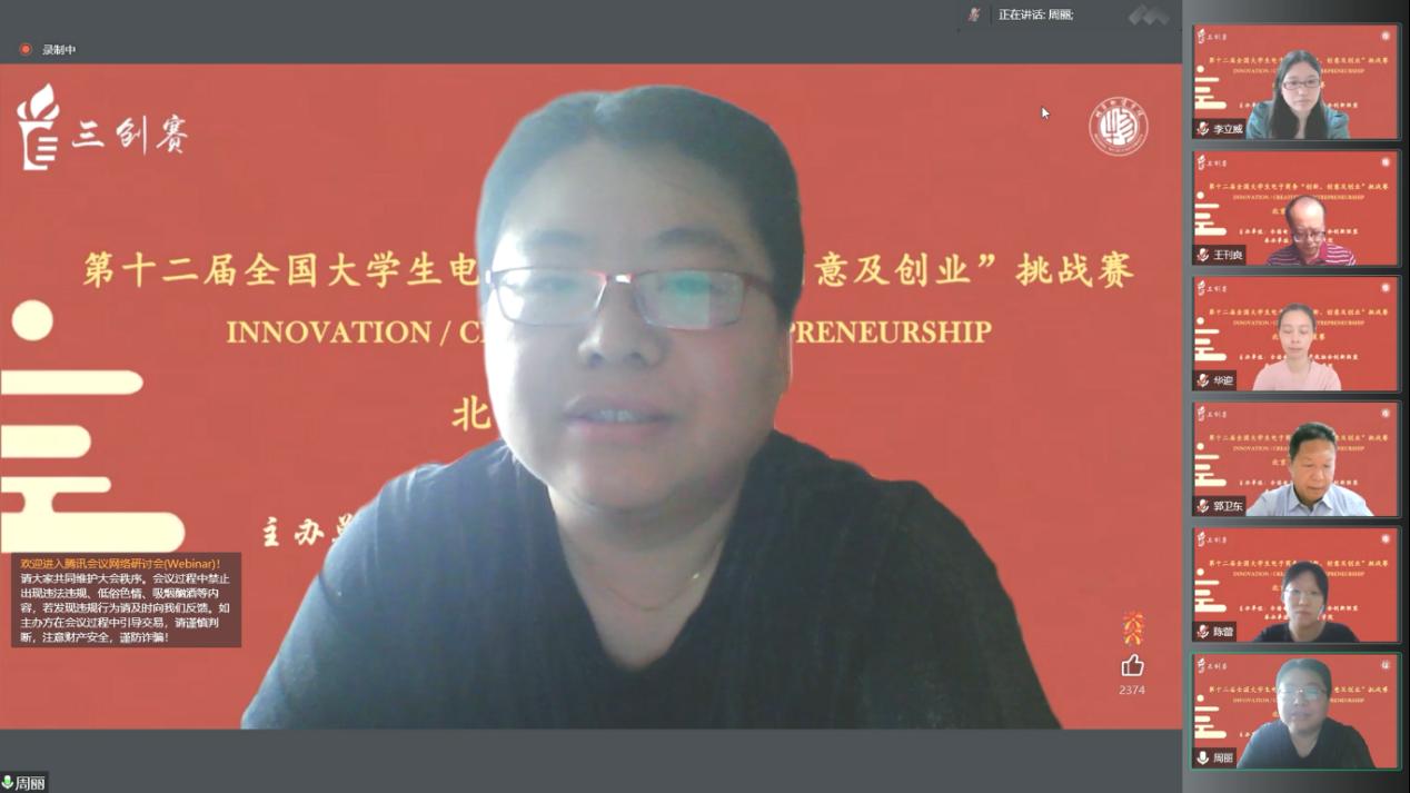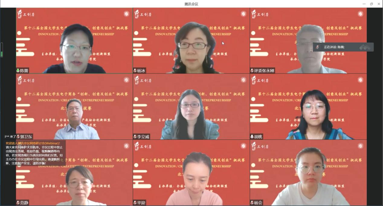 最后,陈蕾副经理对教育部高等公司电子商务类专业教学指导委员会专家,担任本次比赛评委的40多位高校专家和25位企业评委专家,29所高校的参赛团队表示热烈欢迎。北京赛区分组赛采用线上方式开展,晋级省赛的252支参赛团队分成12组进行了激烈的角逐,经专家评议,最终12支团队入围排名赛。