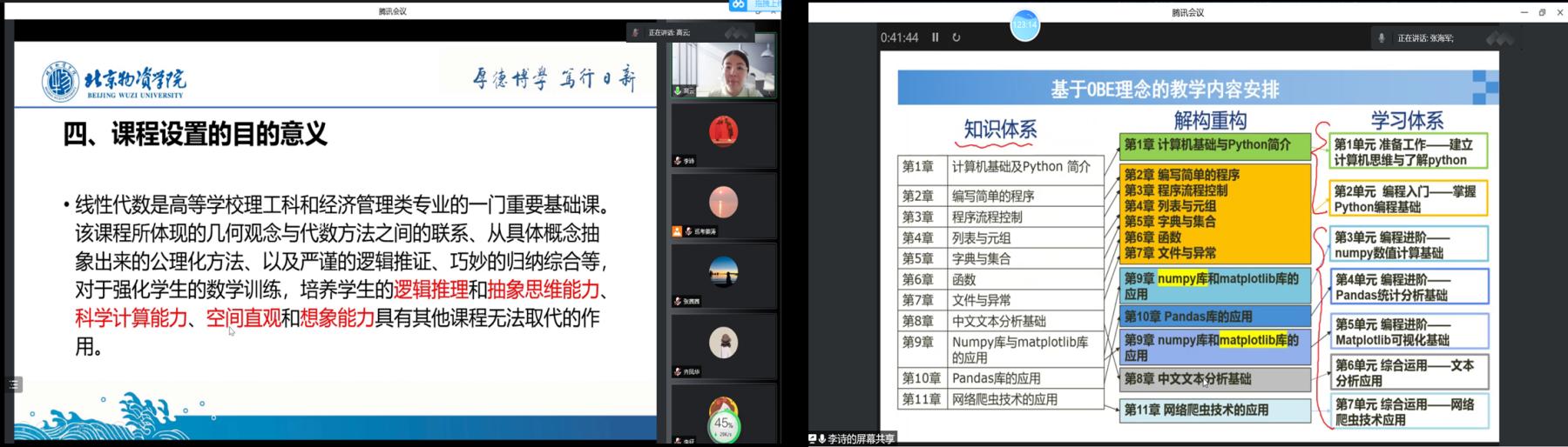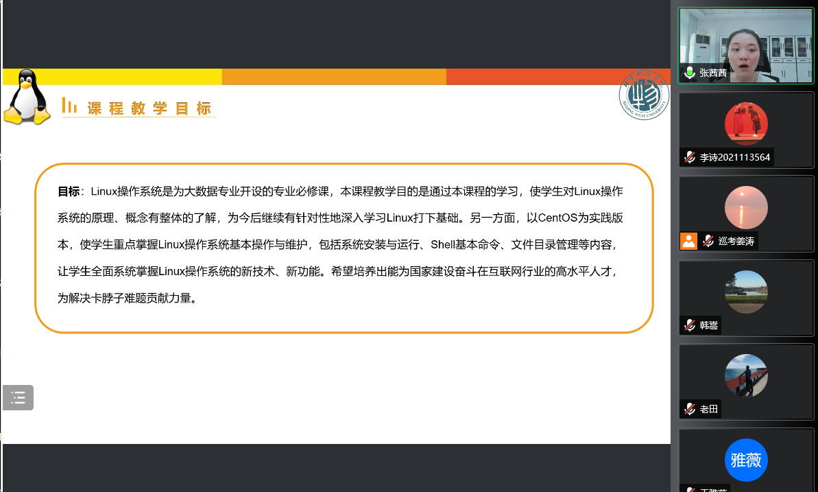 大数据系李诗老师以《大学计算机基础C》课程为例,阐述了OBE模式下的课程设计思路,并选取第一章的部分内容进行了授课展示,张海军老师进行了点评,并对授课章节安排提出修改建议。张茜茜老师对《Linux操作系统》课程进行了说课,选取其中Linux系统概述内容进行授课展示。