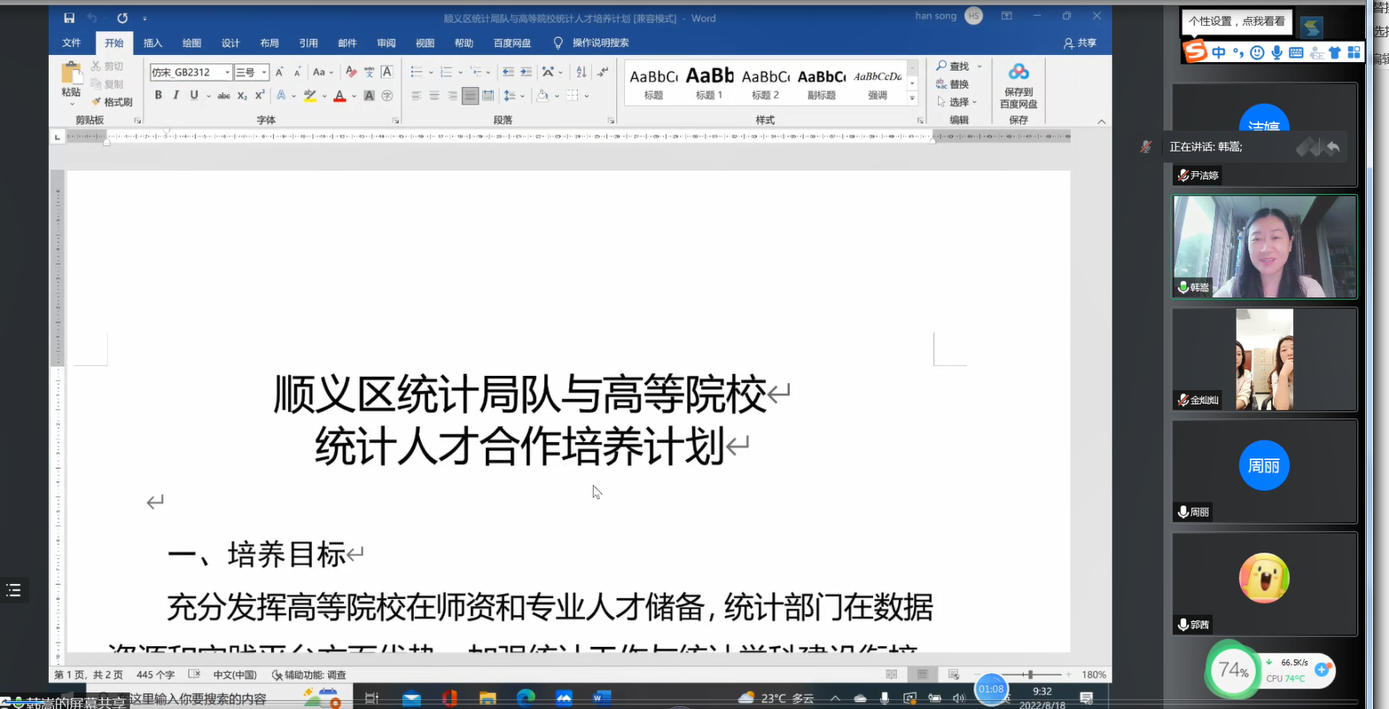 会上,周丽处长表达了对顺义区统计局队的热烈欢迎,韩嵩教授从提供人才资源、提供教育培训资源等方面详细介绍了应用统计系的基本情况,顺义区统计局队统计调查队队长李倩从提供实习平台资源、就业资源、数据资源、合作资源等方面全面介绍了顺义区统计局的整体情况。双方在初步拟定合作协议的基础上,着重就具体的合作方式,培训、竞赛、实习、企业导师等方面事宜进行了详细沟通。希望通过统计人才合作培养,实现优势互补、共同发展,强化应用型统计人才培养,推动统计部门生产力提高。
