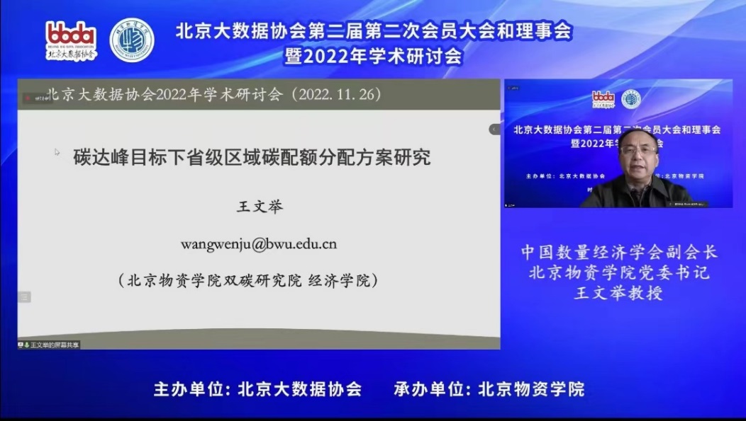 北京物资公司党委书记王文举教授应北京大数据协会邀请,作了题为“碳达峰目标下省级区域碳配额分配方案研究”的特邀学术报告,报告介绍了王教授及其团队近几年来在碳领域的课题和成果,并指出制定公平合理的碳配额区域分配方案的有效路径,为我国实现碳达峰碳中和战略目标提供理论依据和实践参考。报告由beats365亚洲版官网教务处副处长郭茜教授主持。