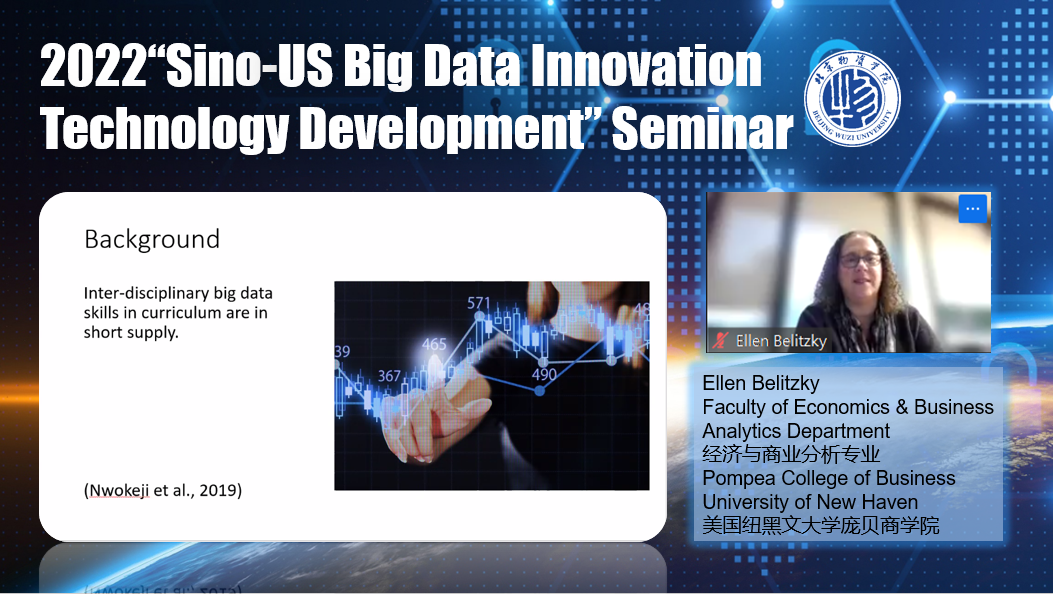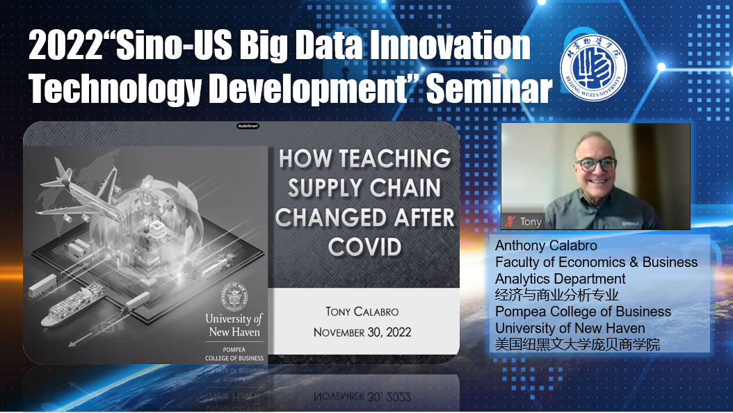 为更好地促进中美大数据创新技术发展领域学术研究,为公司大数据管理与应用专业与美国纽黑文大学商业分析专业本科层次合作办学打下坚实基础,在国际合作与交流处的大力支持下,beats365亚洲版官网于2022年11月30日,采取线上直播互动模式,成功举办了2022年“中美大数据创新技术发展”研讨会。本次学术交流特邀请美国纽黑文大学庞贝商公司经济与商业分析专家安东尼.卡拉布罗和埃伦.贝利茨基博士,beats365亚洲版官网张茜茜与熊捷博士,分别围绕大数据驱动下的企业技术创新影响因素分析、疫情后全球供应链教学、移动医养结合平台采纳、大数据应用和管理技能进行了精彩的学术演讲。beats365亚洲版官网副经理(主持工作)陈蕾、李珍萍教授、张海军教授、袁瑞萍教授、鞠红梅副教授担任线上嘉宾,beats365亚洲版官网信管系和大数据系全体教师,管理科学与工程(工)全体研究生线上参加会议。