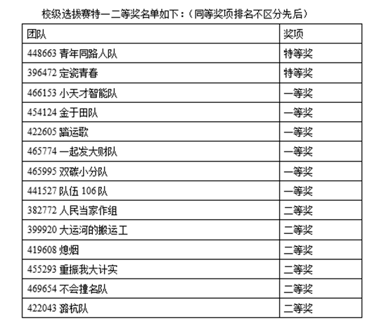 经过两天的精彩角逐,共评选出获奖队伍31支,包含特等奖2名,一等奖6名,二等奖6名,三等奖17名(详情见附件)。其中15支参加终极PK赛,分数由高到低排名,等待省赛承办单位分配晋级名额,根据晋级名额选派对应数量的团队参加省赛。