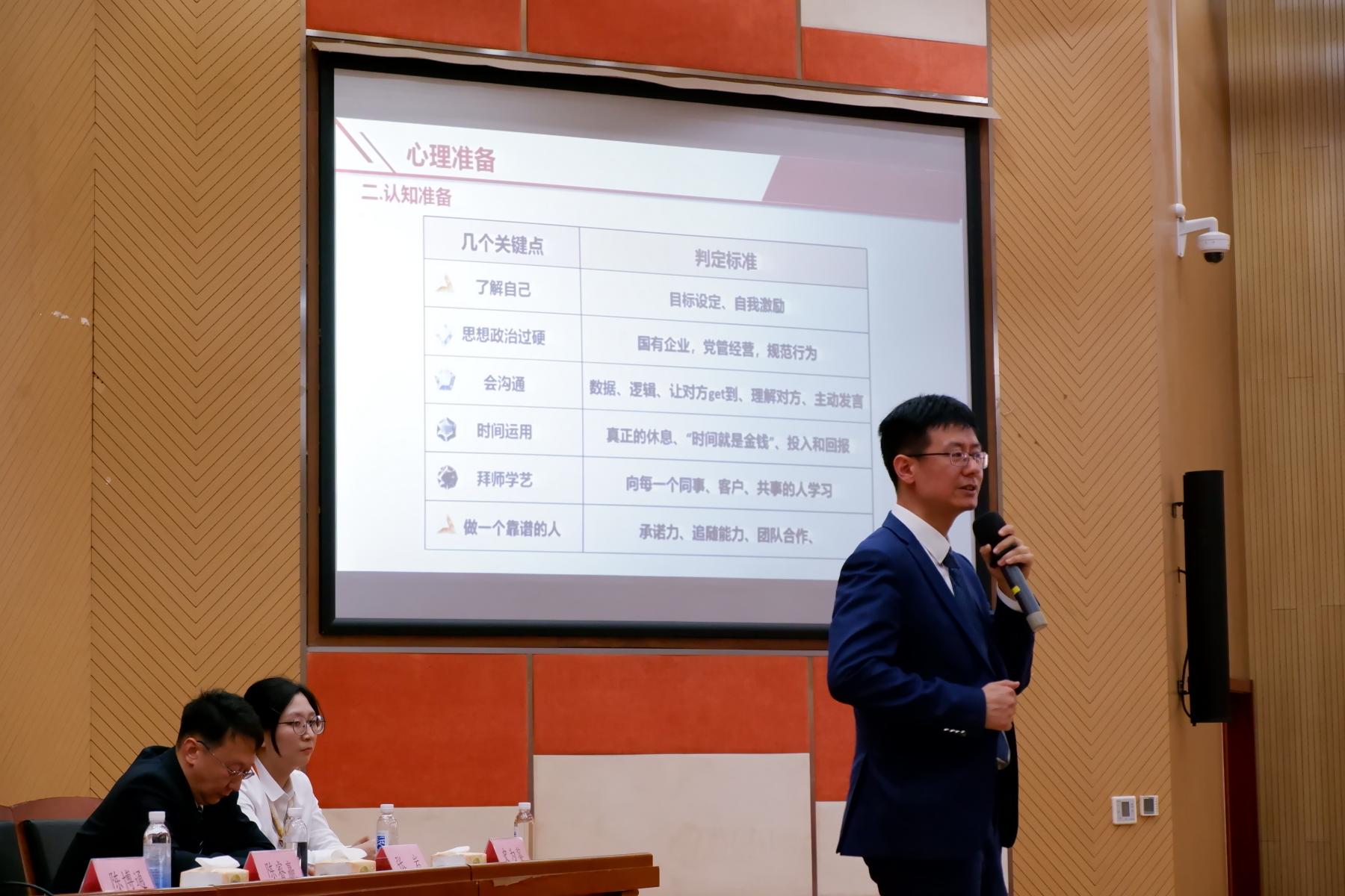 接下来,陈睿赢行长从心理准备、专业准备、职业历程三方面展开分享。他首先讲述当前社会、经济和经营环境的变化,从“了解自己”、“思想政治过硬”、“会沟通”、“时间运用”、“拜师学艺”、“做一个靠谱的人”6个关键点对就业所需要的特质进行了说明,并结合这两方面希望同学们做好求职的心理准备;随后,他以银行从业资格为引介绍专业资格考试的相关内容,并向同学们推荐《毛泽东选集》、《靠谱》等书籍,希望同学们能够做好专业知识储备;最后,他以自己亲身的职业经历讲述了职场中遇到的问题及其解决办法,希望同学们能拓宽视野,通过实践学习新的技能,从而更好的完善自己。